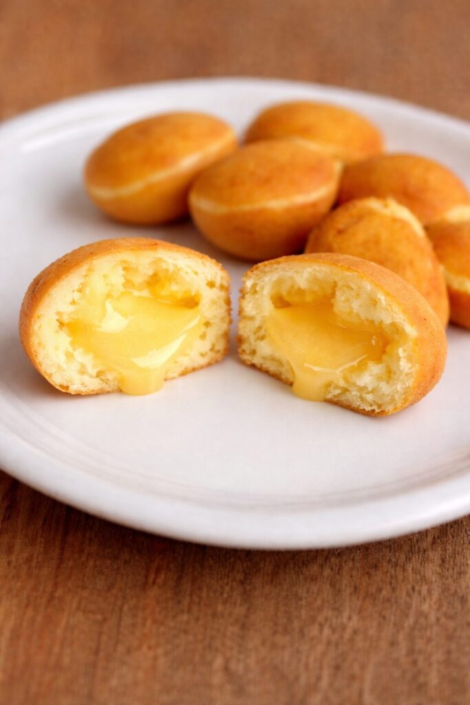 食べると中から温かいカスタードのような液状の生地がとろーりと出てきます。